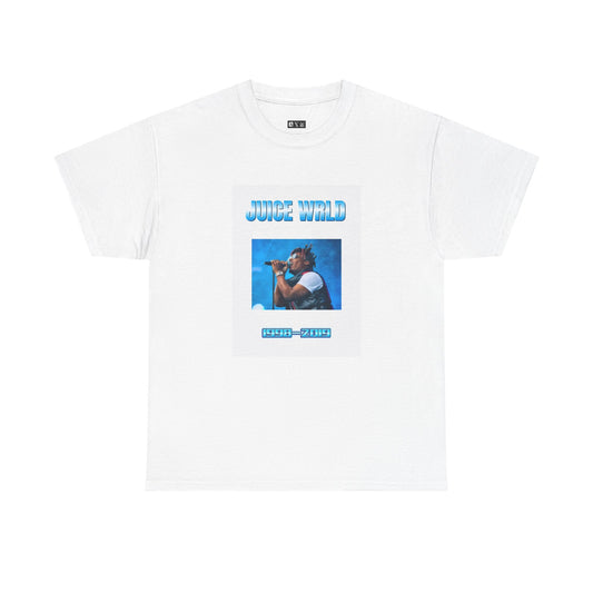 Juice WRLD black unisex heavyweight tee shirt crowned by his name in bold sky-like font and marked with his years—1998–2019—an eternal tribute to a voice gone too soon that will forever echo in time.