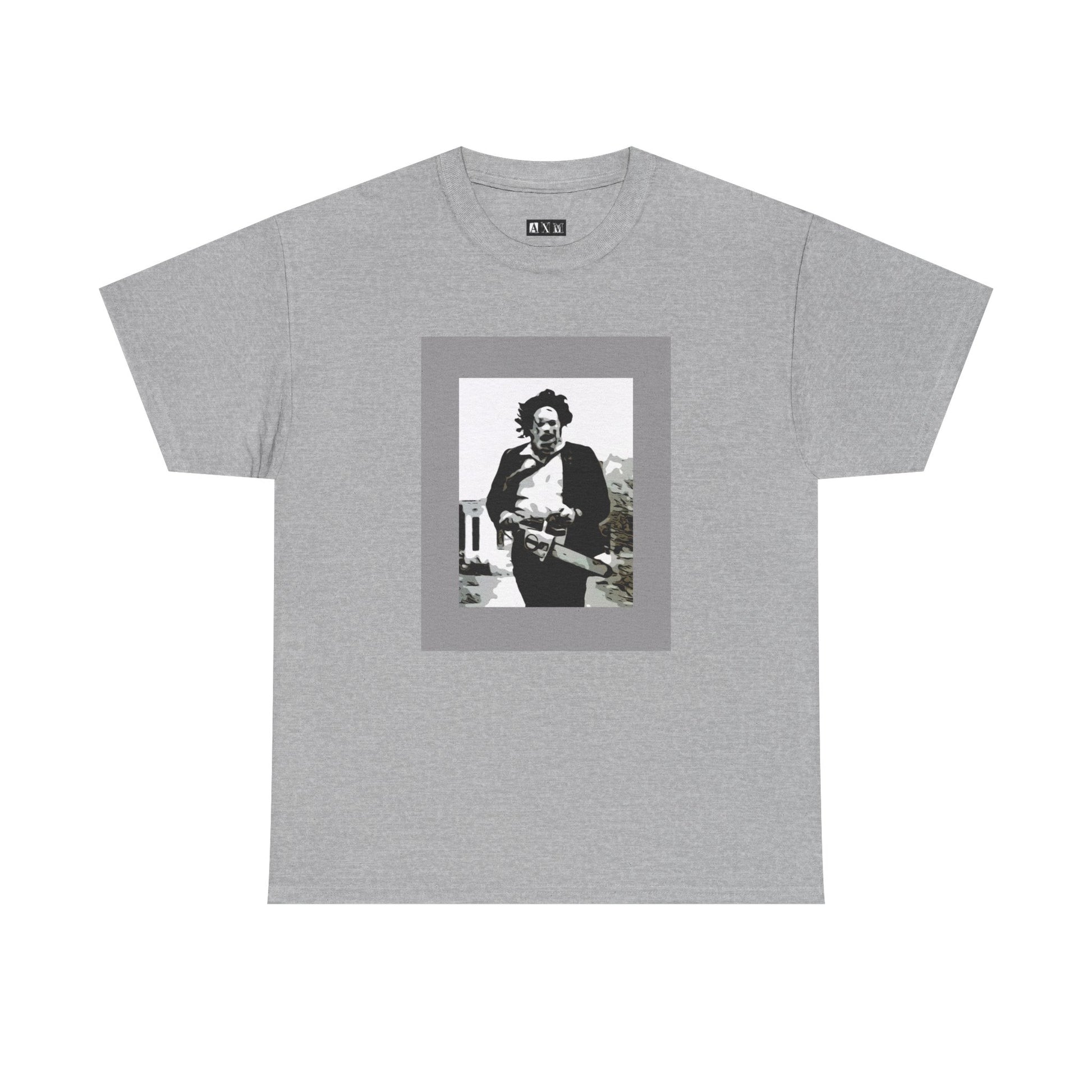 Leatherface black unisex heavyweight tee shirt. Chainsaw in hand, frozen mid-charge—an iconic, chilling tribute to horror’s most infamous figure. Perfect for those who embrace fear with a fearless style.
