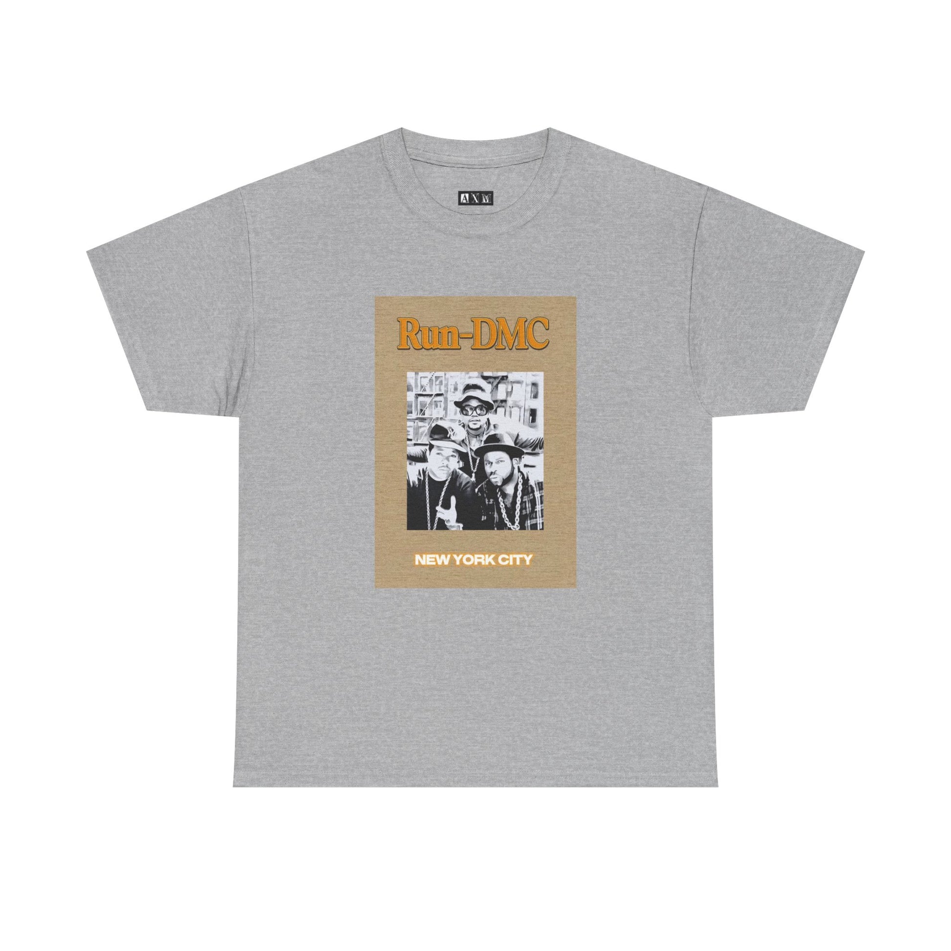Run-DMC unisex heavyweight tee shirt featuring the iconic group posing in classic streetwear, topped with bold orange "Run-DMC" lettering and “NEW YORK CITY” stamped below. A tribute to one of hip-hop’s greatest pioneers.